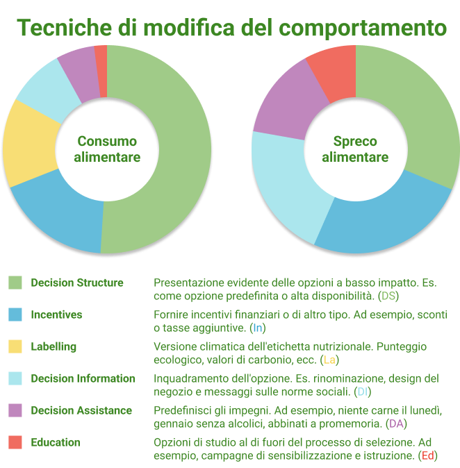 Ciò che va sottolineato è che, tutte le tecniche hanno dimostrato un impatto rilevante nelle ricerche valutate. Pertanto, nessuna di esse dovrebbe essere ignorata quando si sviluppa una strategia di cambiamento comportamentale. La struttura decisionale è quella che mostra i risultati più promettenti, ma rappresenta meno della metà del potenziale totale e sembra meno efficace quando si tratta di comportamenti legati allo spreco alimentare.