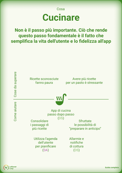Cucinare in modo più semplice elimina gli ostacoli alla sperimentazione di nuove ricette. Ricette migliori. Migliori per la salute, il clima e il gusto. Questo motivo è già sufficiente per dedicare impegno a questa fase, ma come parte di un sistema integrato che supporta anche altre fasi, questa ottimizzazione potrebbe essere il motivo per cui gli utenti inizieranno a utilizzare la soluzione e trarranno vantaggio dalle altre ottimizzazioni come “danno collaterale”.