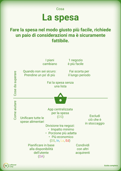 E, quarto, scegliere il negozio e il prodotto giusto è difficile. Scegliere tra prodotti biologici e industriali può essere difficile e l’etichettatura può creare confusione. Quanto è rilevante la differenza di impatto? Giustifica le possibili differenze di prezzo dal punto di vista dell’utente? Le porzioni standardizzate nei supermercati corrispondono a ciò che serve? Quali sono i vantaggi di acquistare nei negozi specializzati locali, come il fruttivendolo sotto casa? Come organizzare la spesa tra più negozi?